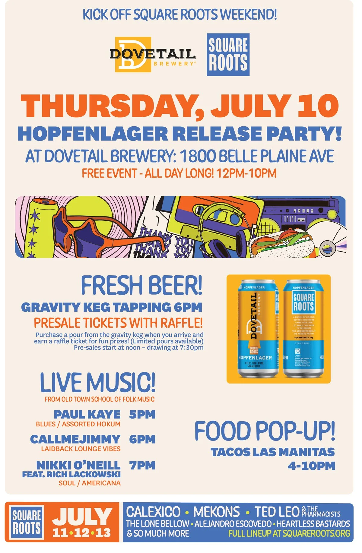 And what’s a Square Roots party without live music? Come on by for a showcase by the Old Town School of Folk Music, Paul Kaye at 5pm, followed by CALLMEJIMMY, and Nikki O’Neill featuring Rich Lackowski. Tacos Las Manitas will pop up from 4–10pm. Whew, what a night! Let’s kick off Square Roots weekend together!